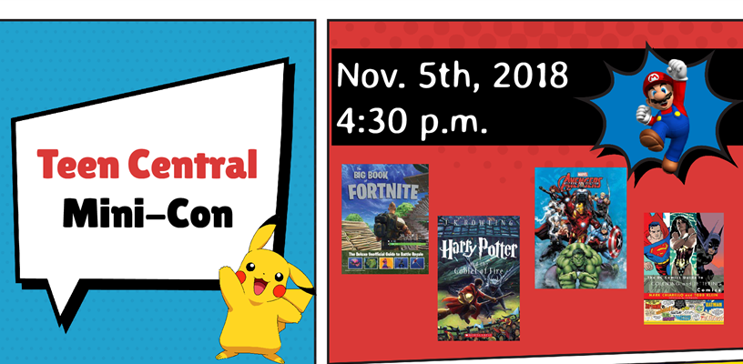 Teen Central’s first ever Mini-Con! We will have three booths set up around Teen Central with themes of popular games, Harry Potter, and DC and Marvel comics. Each booth will have at least three crafts for you to make and take - rotate through all of the booths or just hang out at your favorite. Snacks will be provided so please make sure you turn in your waivers.